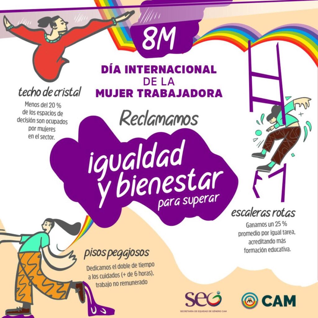 “En el Día Internacional de la Mujer Trabajadora, pedimos igualdad y bienestar”, enuncia la imagen diseñada por la Secretaría de Equidad de Género de CAM, para visibilizar los pisos pegajosos, las escaleras rotas y los techos de cristal que enfrentan las mujeres en sus espacios laborales.