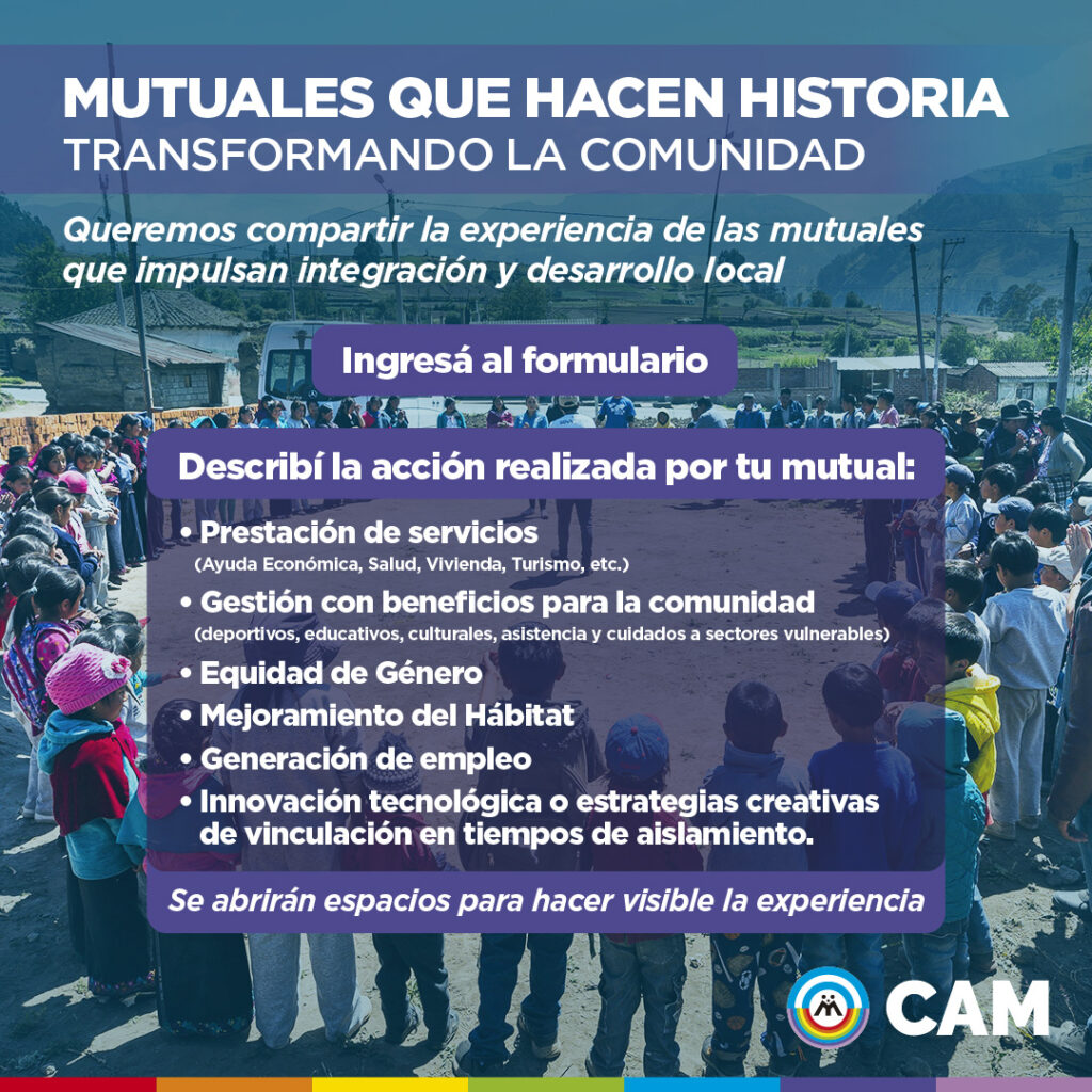Bajo el título “Experiencias mutuales que hacen historia transformando la comunidad” la Confederación Argentina de Mutualidades (CAM) realiza una convocatoria a las entidades que quieran mostrar experiencias exitosas en servicios para sus asociados dentro la extensa gama de prestaciones que brindan; en gestión con beneficios para la comunidad, ya sean deportivos, educativos, culturales de asistencia y/o cuidados a sectores vulnerables tales como adultos mayores, jóvenes y niños; actividades orientadas a mejorar las condiciones de género, cuidado del hábitat, generación de empleo; que involucren innovación tecnológica en la relación de la entidad con sus asociados o hayan creado sistemas o vínculos novedosos y creativos en tiempos de aislamiento obligatorio en el marco de la Pandemia.