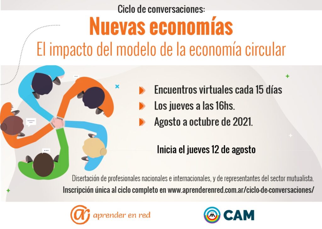 Desde el Centro de Capacitaciones Virtuales de la Confederación Argentina de Mutualidades invitamos a toda la comunidad a participar del Ciclo de Conversaciones: Nuevas economías. El impacto del modelo de la Economía Circular que se realizará desde el mes de agosto a octubre de 2021 y contará con la disertación de profesionales nacionales e internacionales, y de representantes de la economía social y solidaria. El ciclo tiene el objetivo de acercar conversaciones por videoconferencia sobre las nuevas economías, abordando específicamente el modelo de la Economía Circular. Todos los temas incluyen el abordaje de género e inclusión de manera transversal.