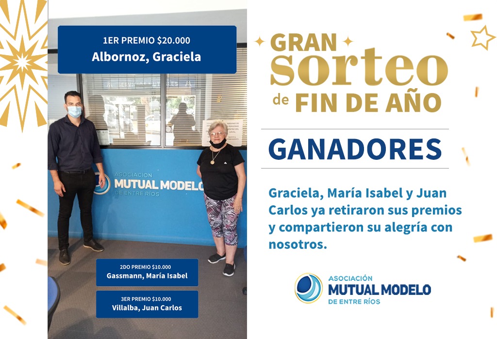 El pasado 30 de diciembre del 2020 se llevó adelante el “GRAN SORTEO DE FIN DE AÑO” de la Asociación Mutual Modelo de Entre Ríos, el cual fue transmitido en vivo por la pantalla de EL ONCE TV en el programa Buenas Noches. El sorteo repartió $40.000 en 3 premios, el primero de $20.000, el segundo y tercero de $10.000. Graciela, María Isabel y Juan Carlos fueron los afortunados ganadores y pasados unos días pasaron a retirar sus respectivos premios contándonos sus experiencias.